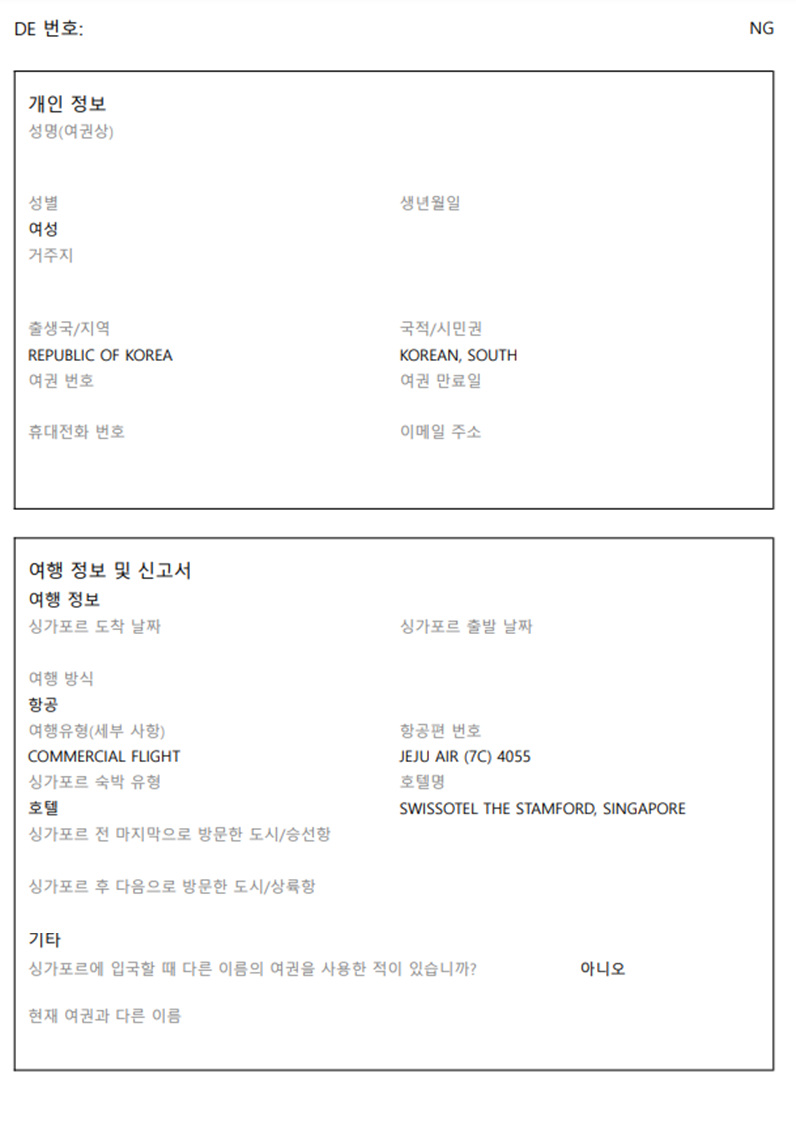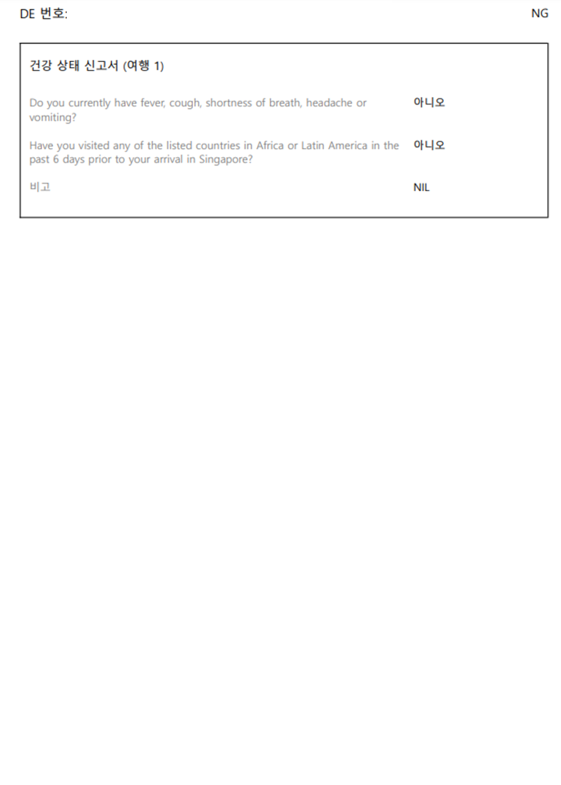 👉 SG카드는 입국신고서이기 때문에 단순히 경유하는 경우에는 SG카드를 작성하지 않아도 됩니다. 싱가포르에 도착하는 비행기를 내릴 때가 아니라, 싱가포르 입국심사를 받을 때 작성하는 서류라고 생각하면 됩니다.