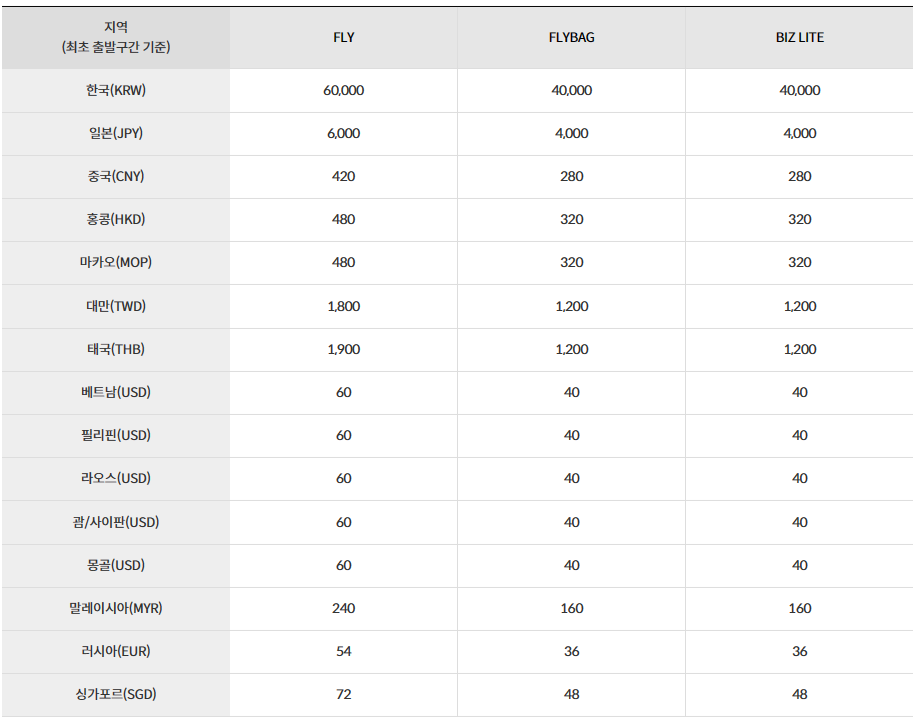 | 출발시점 | FLY | FLYBAG | BIZ LITE |