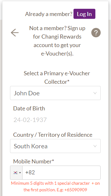 다음으로 넘어가면 창이 리워드 로그인 또는 회원가입란이 나옵니다. 이미 창이 리워드에 가입된 상태라면 로그인을 누르고, 아니라면 국가, 전화번호, 이메일, 패스워드를 입력해 회원가입을 진행합니다.